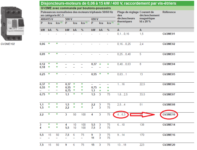 Le choix et le réglage du disjoncteur moteur se fait en fonction de :