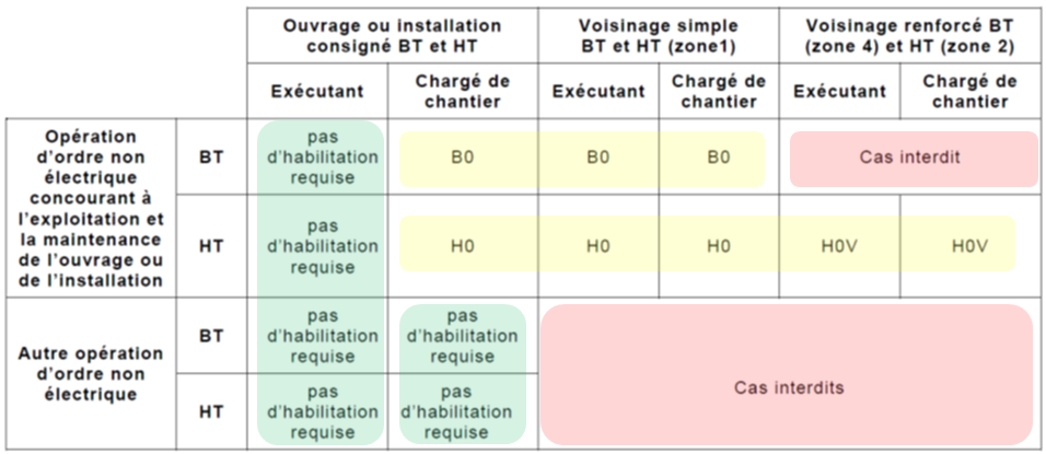 Ce sont de travaux d'ordres non électriques (peintre, maçon, technicien de surface, opérateur machine, ...) confiés à des personnes habilitées connaissant les risques électrique