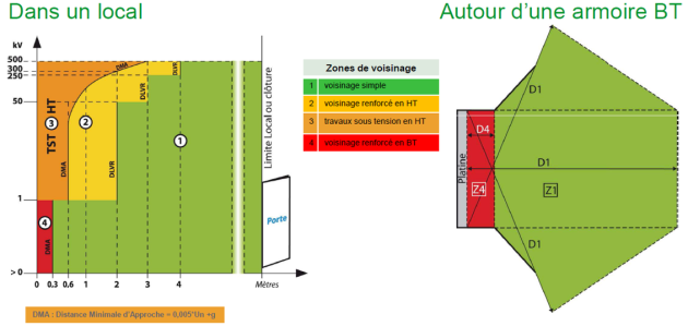 Pour déterminer les prescriptions à respecter, l’environnement autour des pièces nues sous tension (PNST) et l’environnement autour des CANALISATIONS ISOLÉES est découpé en différents volumes appelés zones.